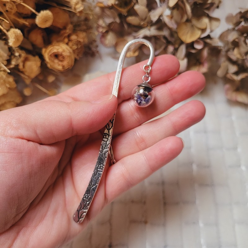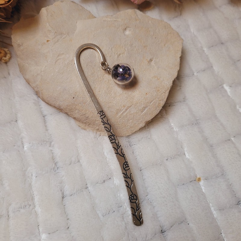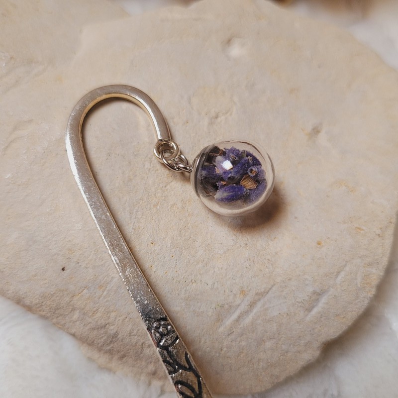 Sublimez vos moments de lecture avec ce marque-page en métal argenté, orné d’un pendentif en verre contenant de délicates fleurs séchées de Lavande.