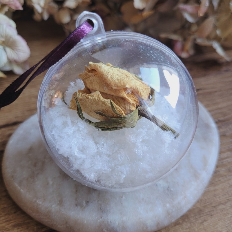 Apportez une touche florale et délicate à votre sapin de Noël avec cette jolie boule en plastique remplie d'une fleur de Bouton de Rose jaune et de fausse neige.