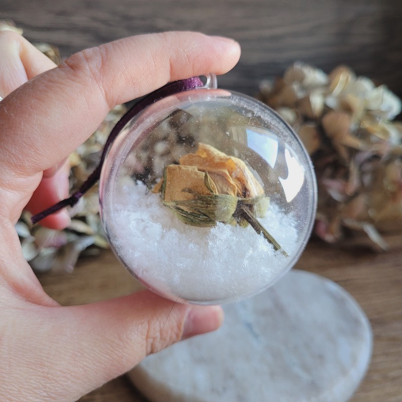 Idéale pour une déco de Noël élégante et naturelle, cette boule de Noël avec fleurs séchées et fausse neige embellira votre intérieur tout en douceur.