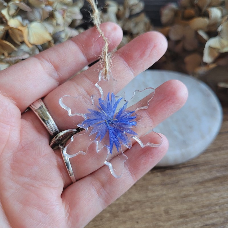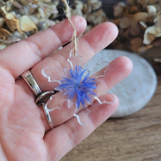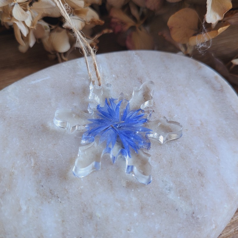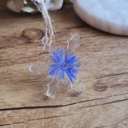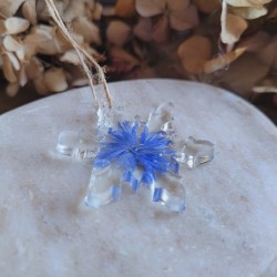 Entièrement réalisée en résine et décorée de fleurs séchées de Bleuet, cette pièce artisanale unique apportera une ambiance chaleureuse et festive à vos fêtes de Noël.