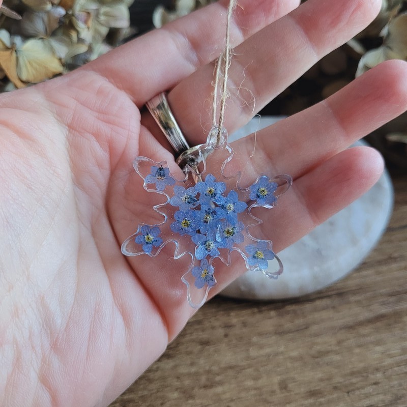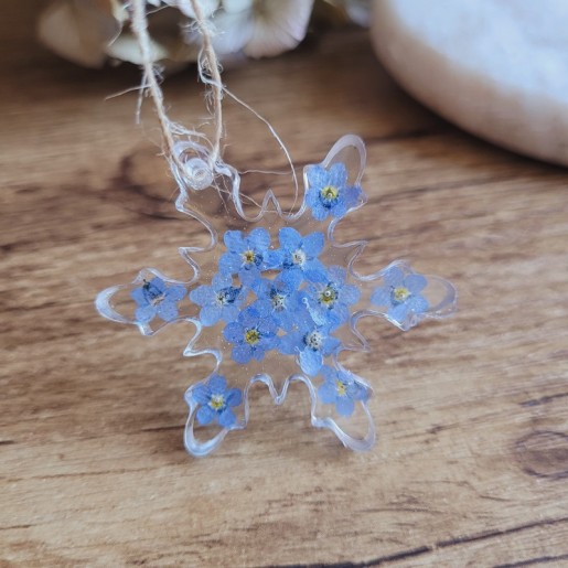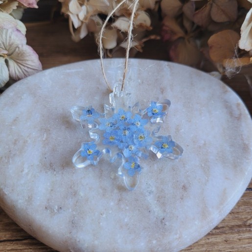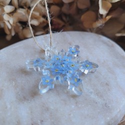 Entièrement réalisée en résine et décorée de fleurs séchées de Myosotis, cette pièce artisanale unique apportera une ambiance chaleureuse et festive à vos fêtes de Noël.