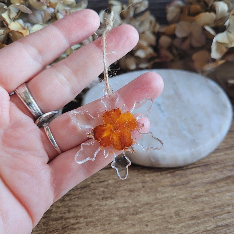 Entièrement réalisée en résine et décorée de fleurs séchées d'Oeillet d'Inde, cette pièce artisanale unique apportera une ambiance chaleureuse et festive à vos fêtes de Noël.