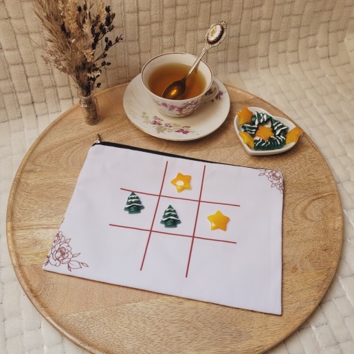 Le plateau est intégré à une jolie pochette zippée en tissu polyester, sur laquelle la grille est imprimée.