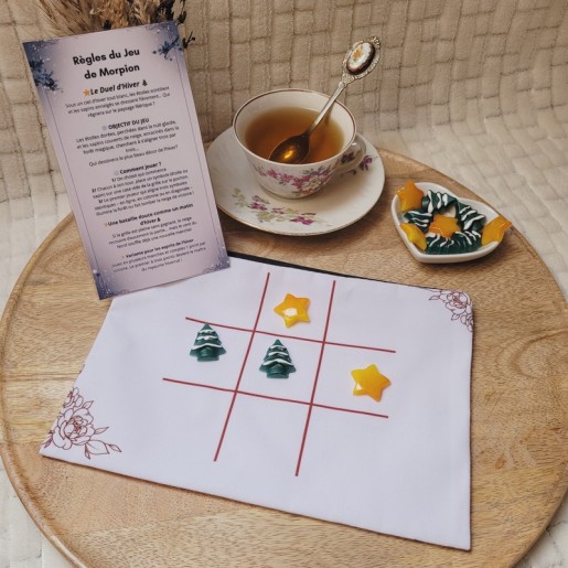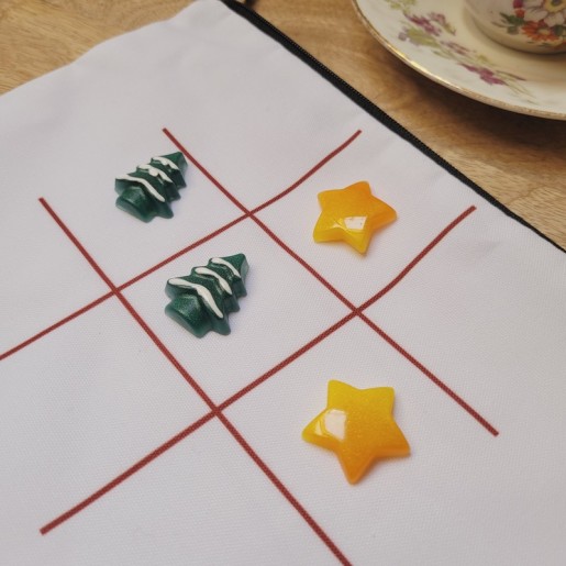 À l’intérieur, vous trouverez des pions réalisés à la main en résine, en forme d'étoiles et de sapins, pour des parties gourmandes!